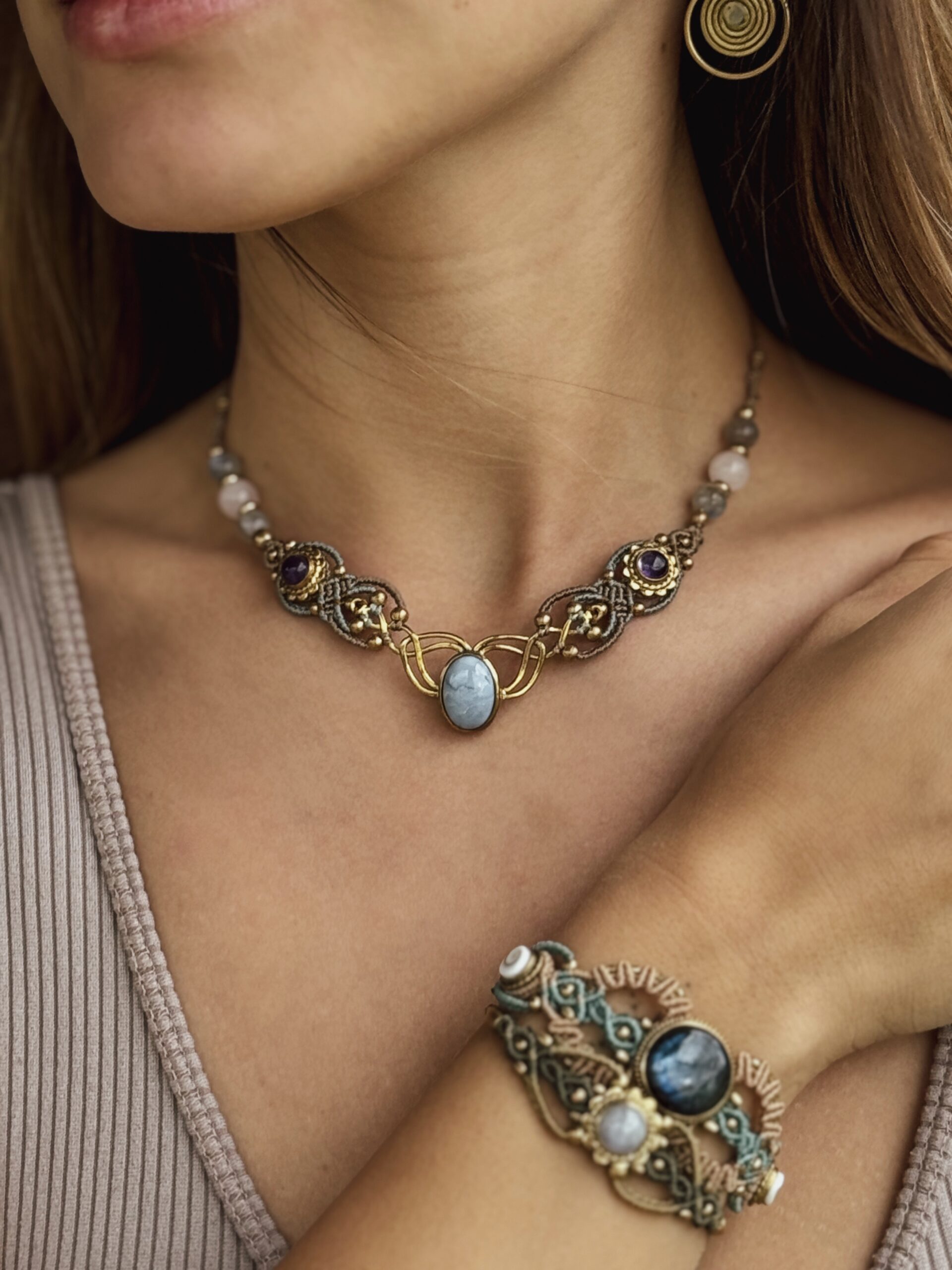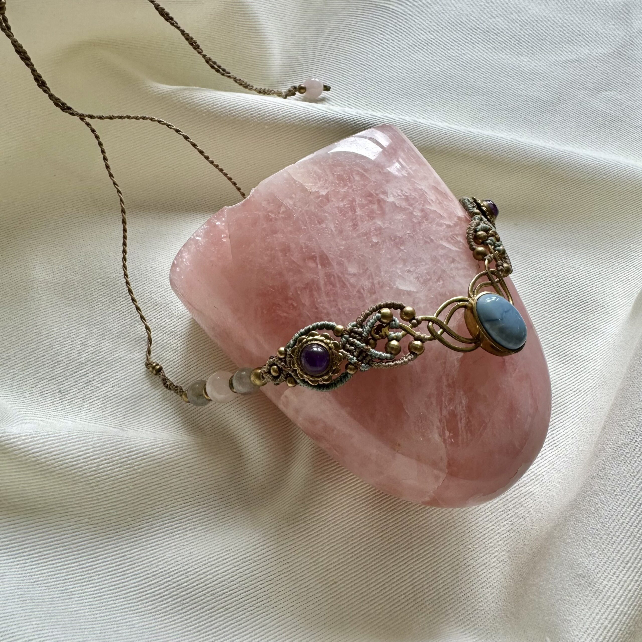 This handcrafted micromacrame necklace features an Andean Opal crystal and delicate brass details. A subtle statement piece designed to bring emotional balance, softness, and gentle clarity into your everyday life.
