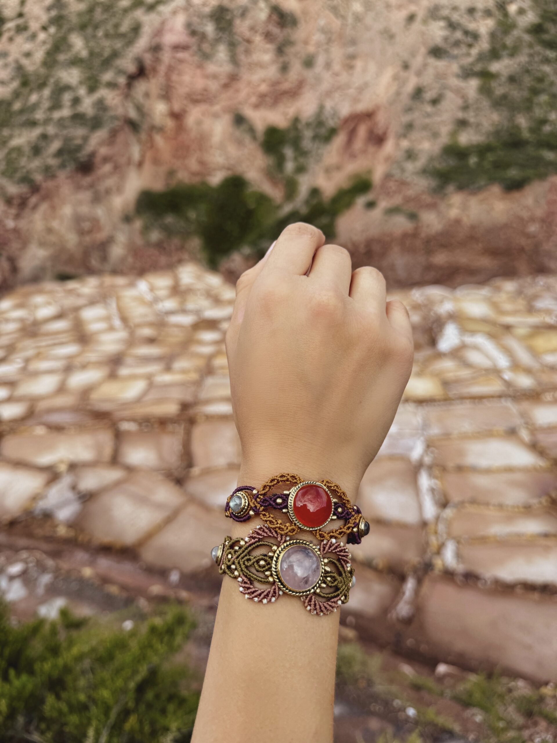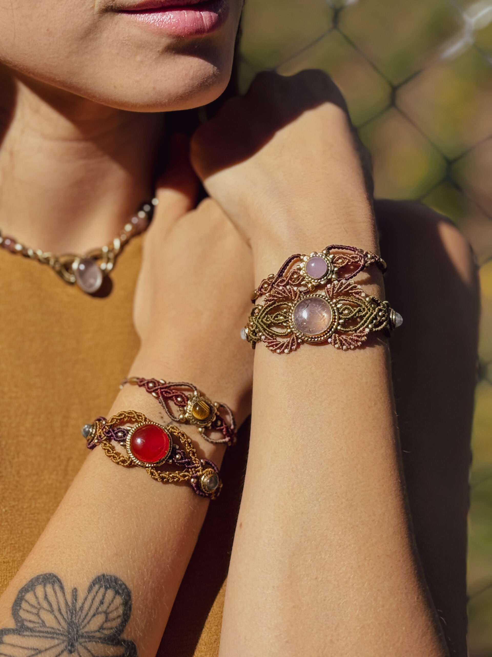 This handcrafted micromacrame bracelet features a Carnelian crystal centerpiece, intricate woven details, and delicate brass accents. A subtle statement piece designed to bring vitality, confidence, and creative energy into your everyday life.