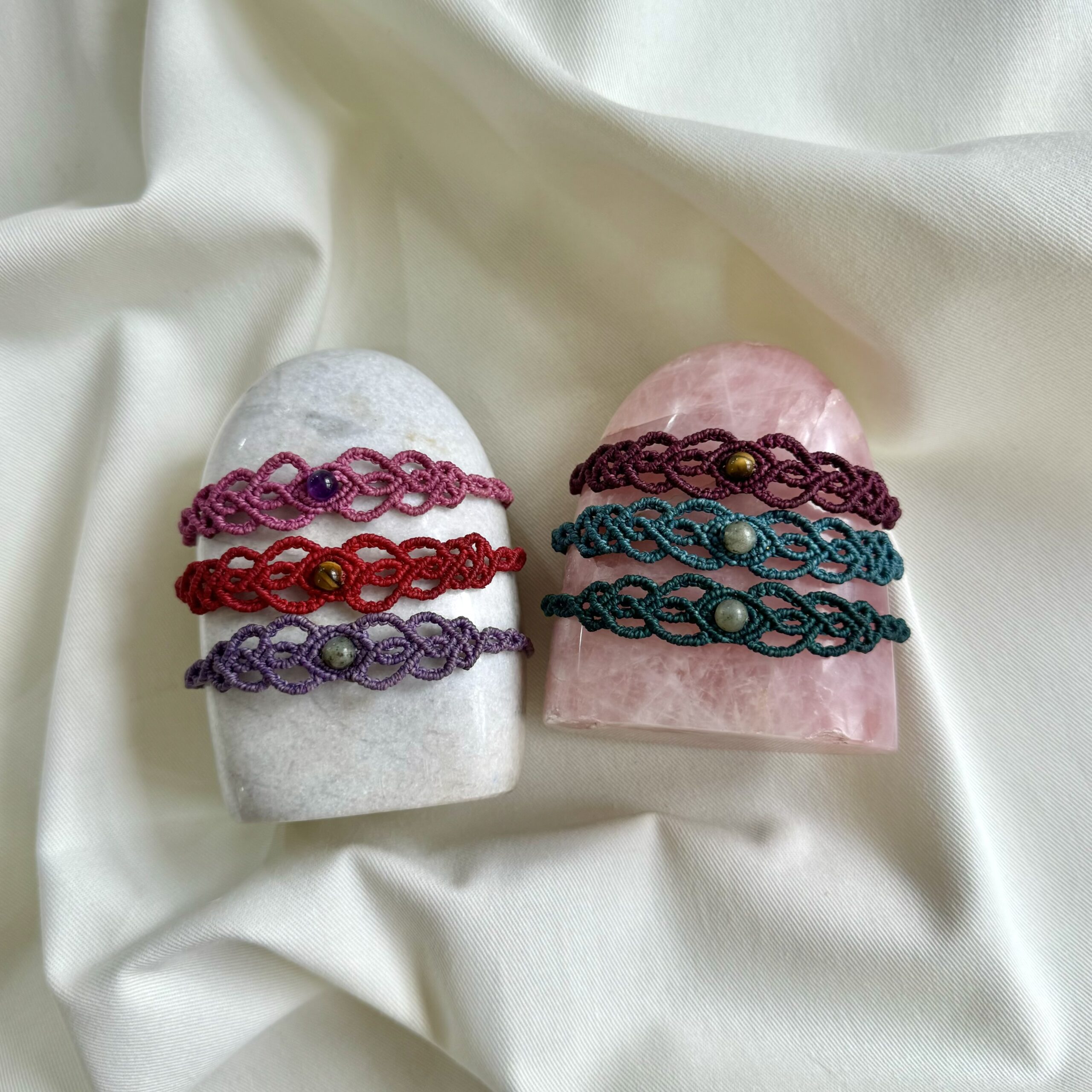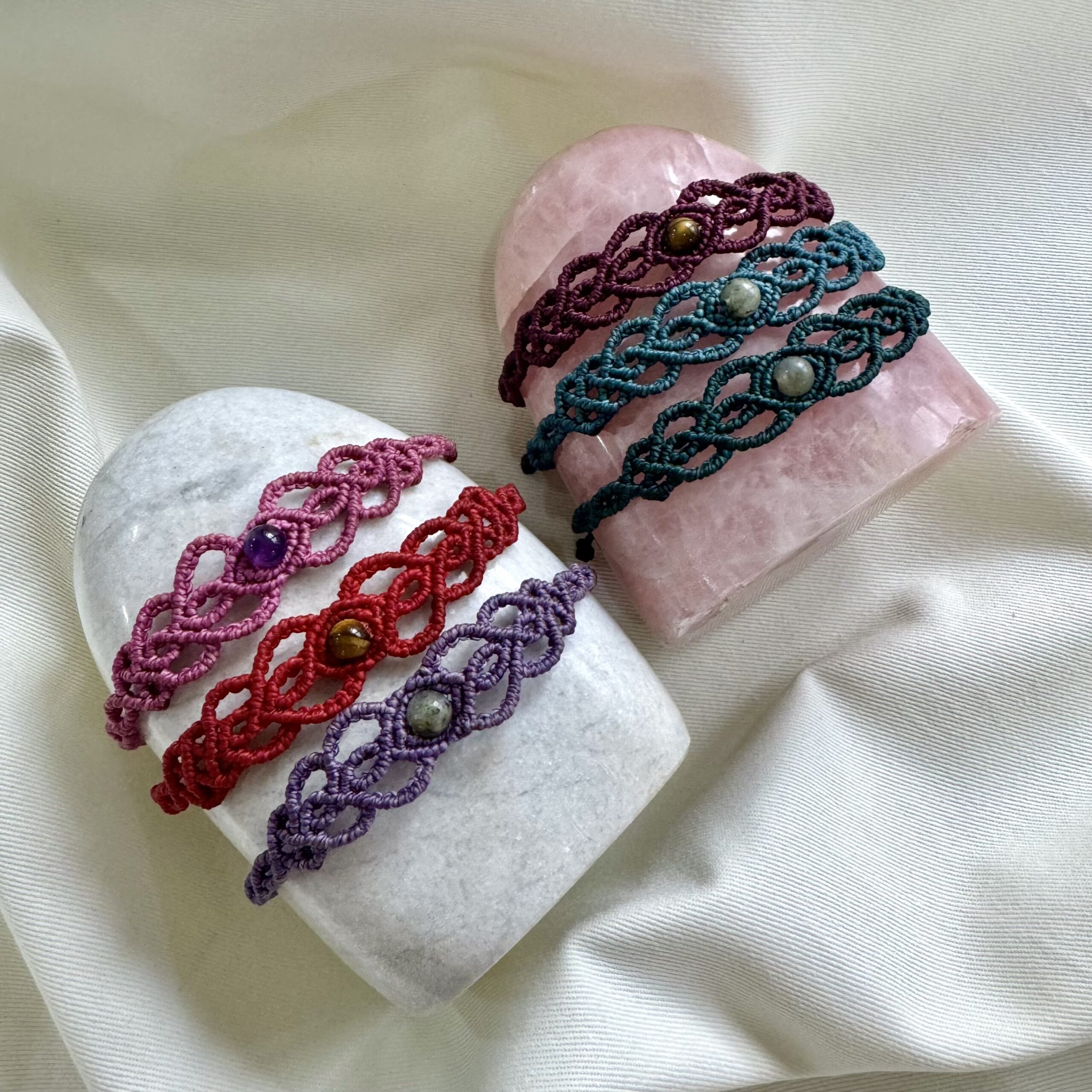 These delicate macrame bracelets carry a small crystal to bring subtle beauty and energy to your everyday life. Wear alone or stack with others to create your own personal combination.