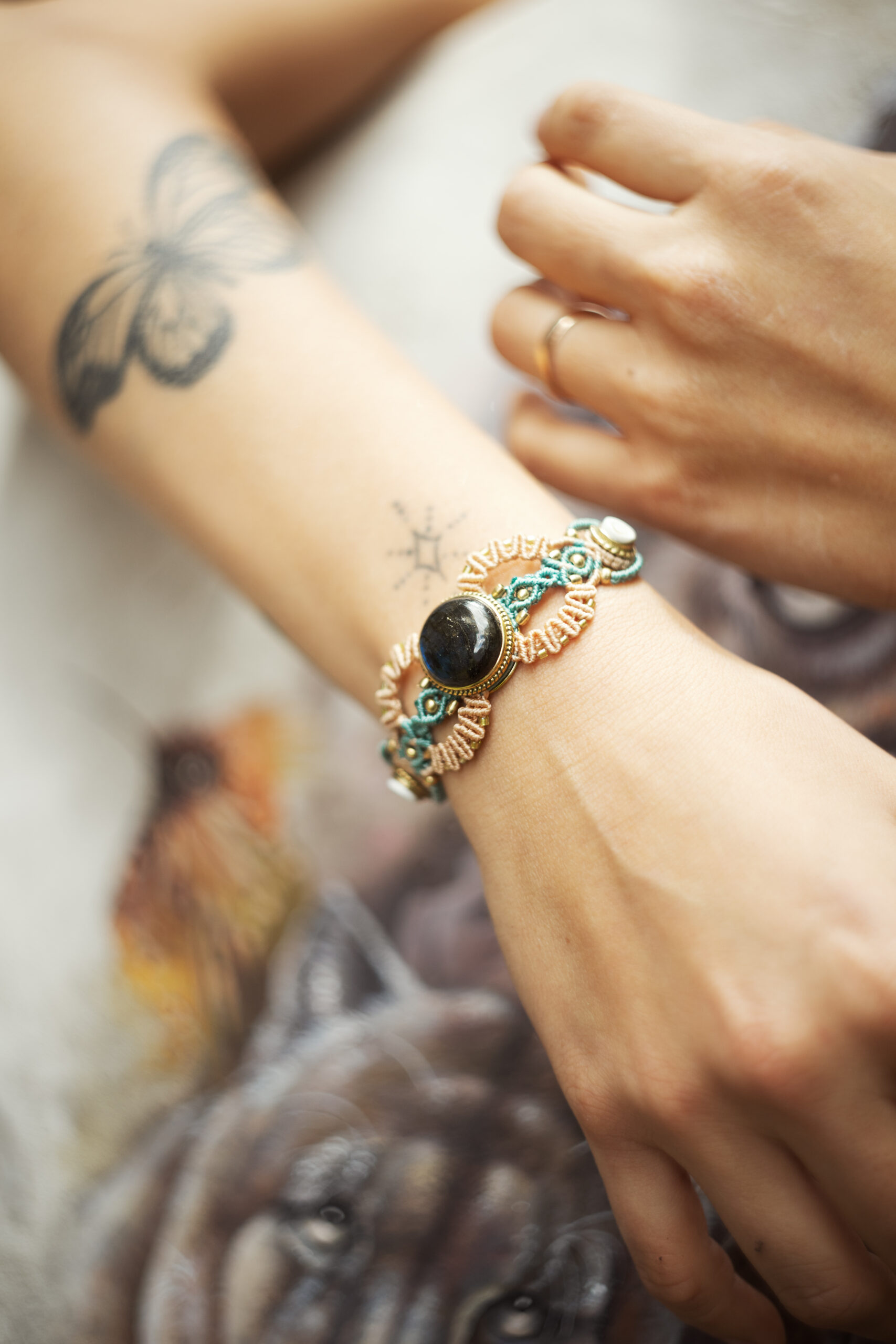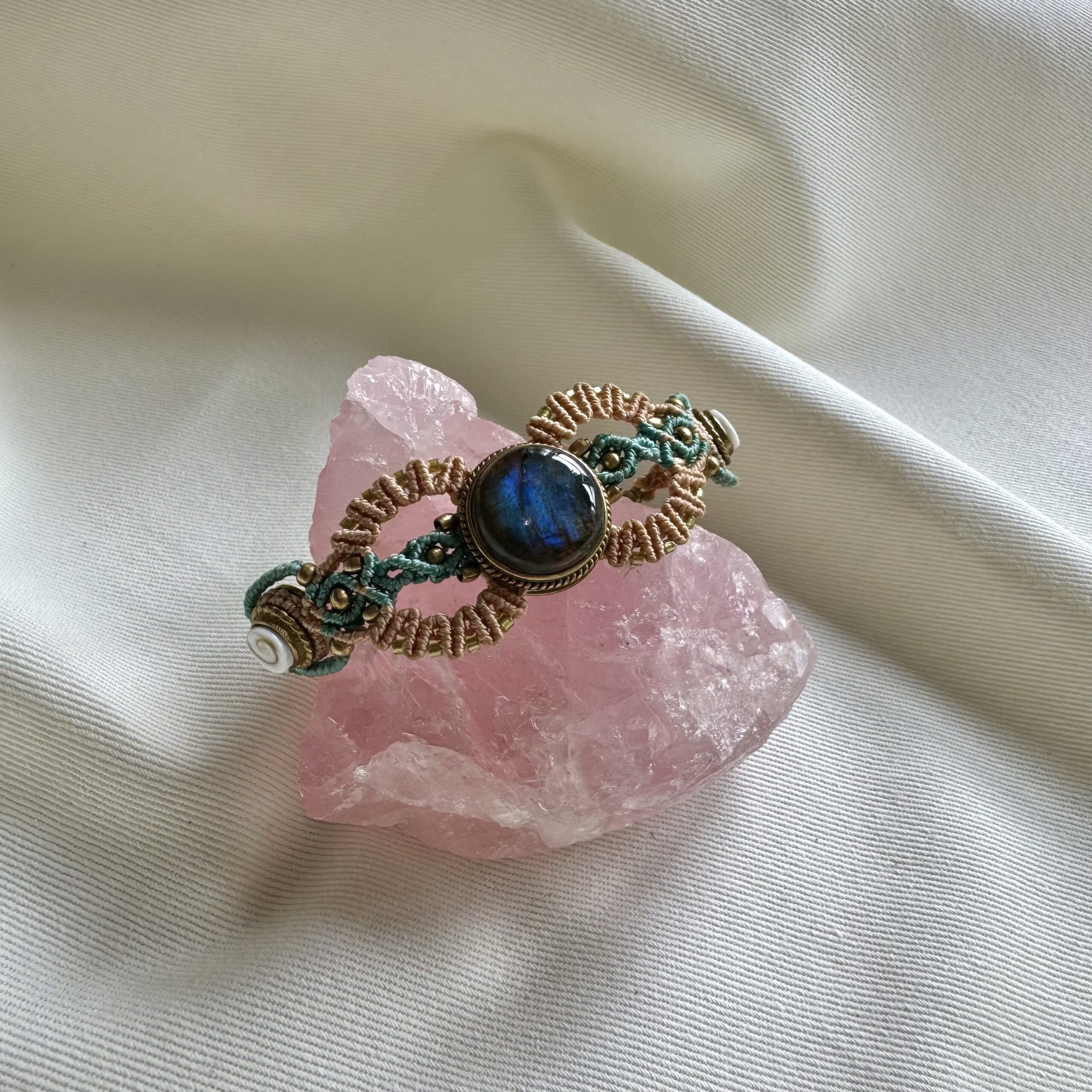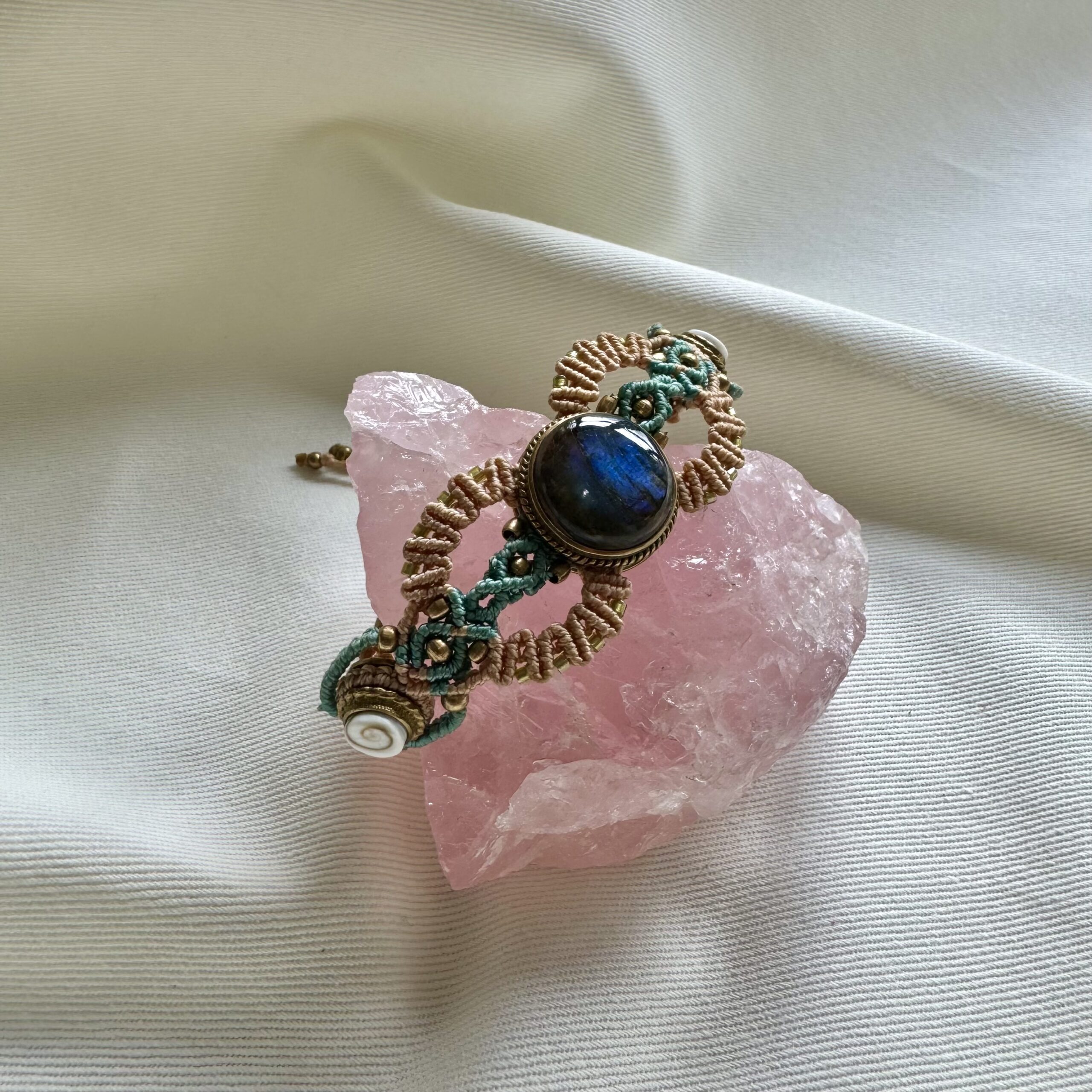This handcrafted micromacrame bracelet features a Labradorite crystal centerpiece with delicate Shiva Eye details and brass accents. A subtle statement piece designed to bring protection, intuition, and transformation into your everyday life.