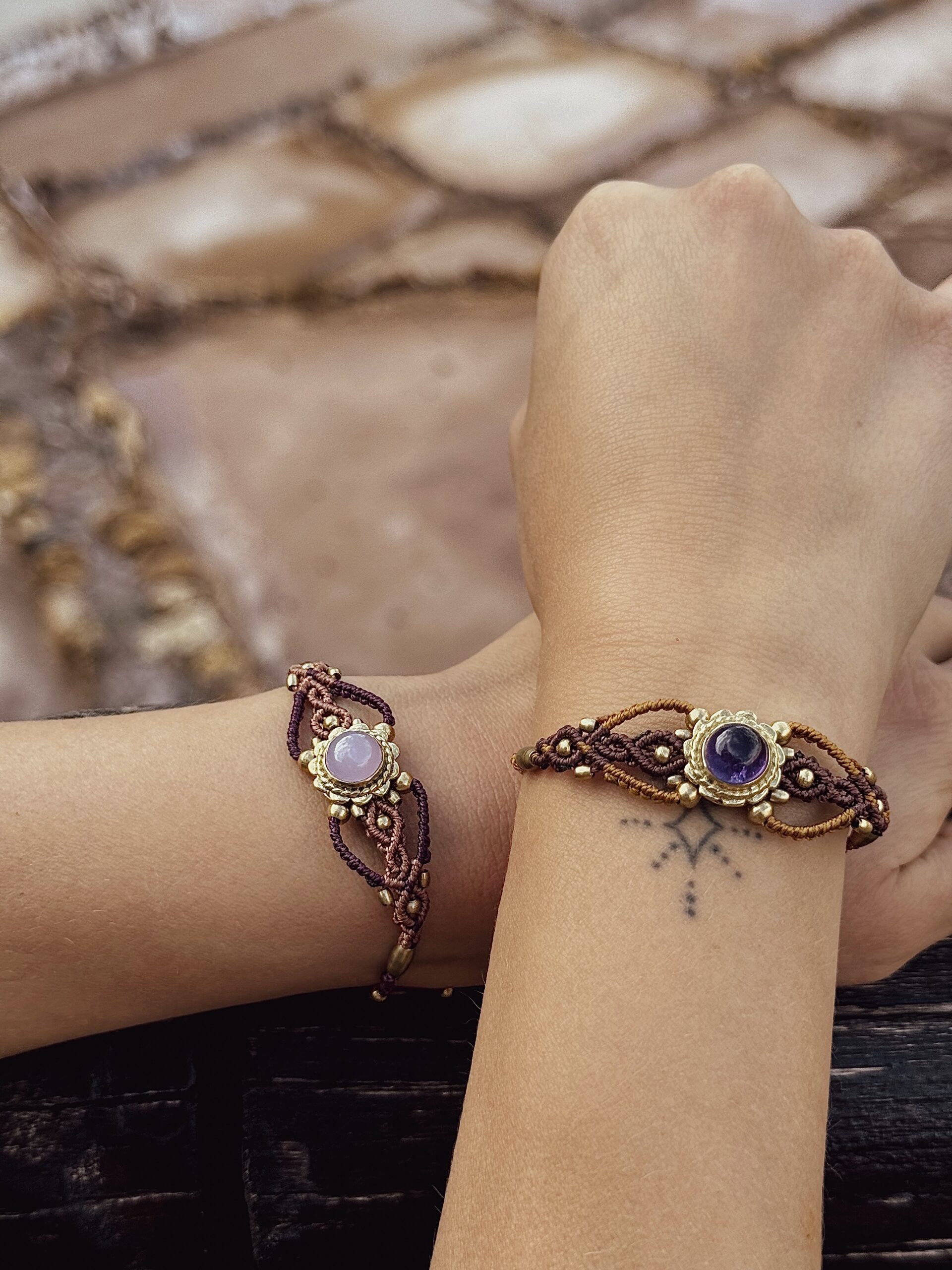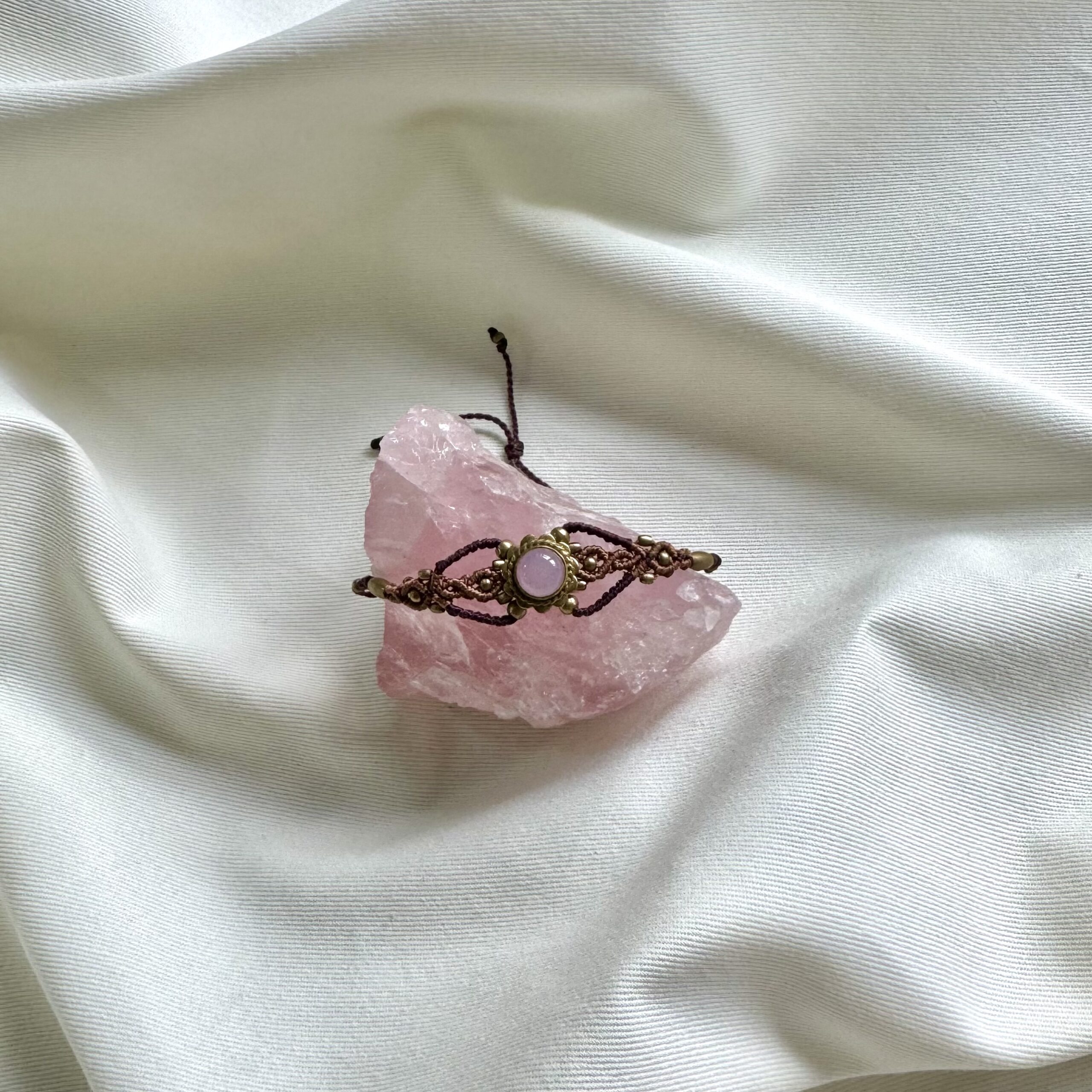 This handcrafted micromacrame bracelet features a Rose Quartz crystal with delicate brass details. A subtle statement piece designed to bring love, emotional healing, and gentle feminine energy into your everyday life.