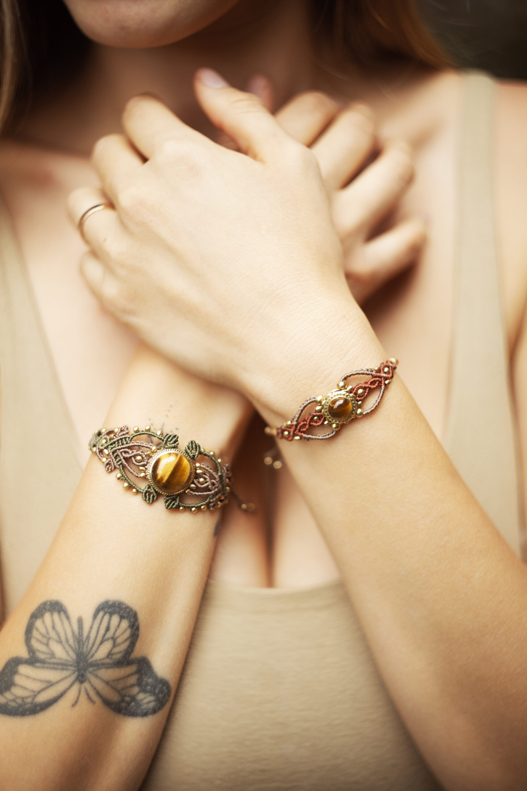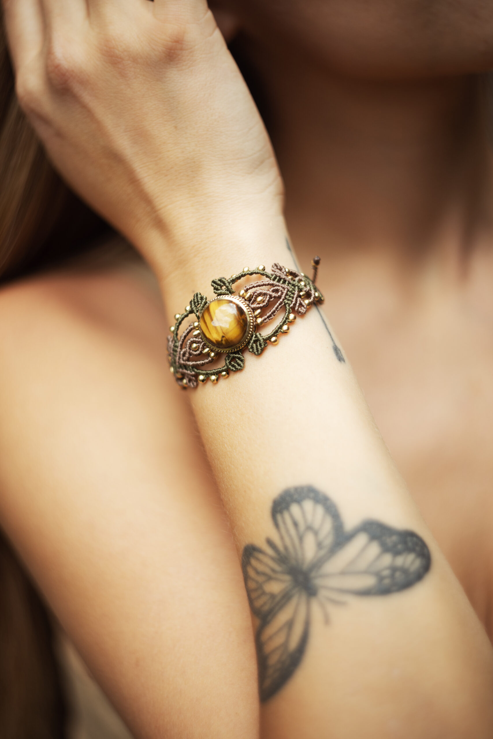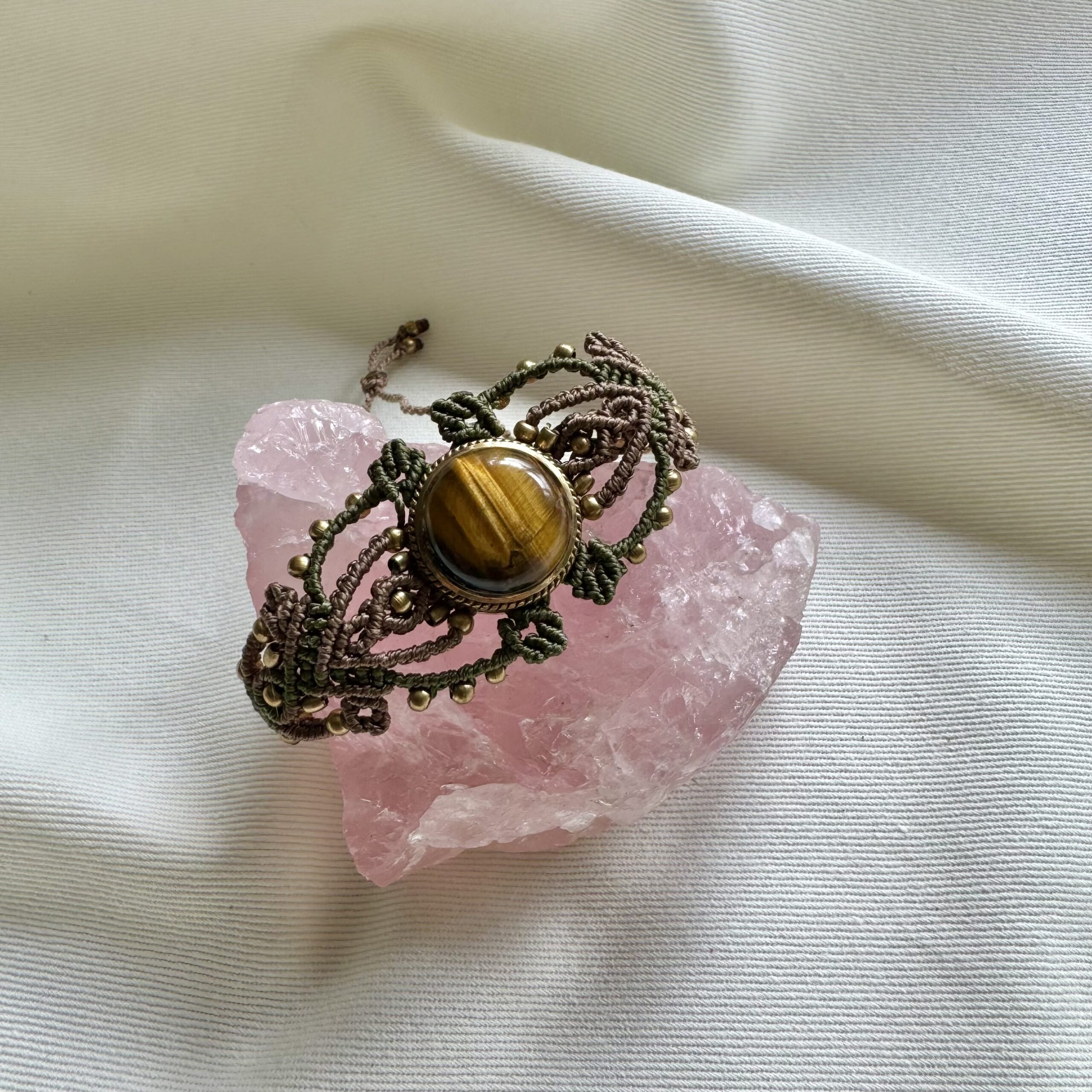 This handcrafted micromacrame bracelet features a Tiger’s Eye crystal centerpiece with intricate woven details and brass accents. A subtle statement piece designed to bring grounding energy, confidence, and protection into your everyday life.